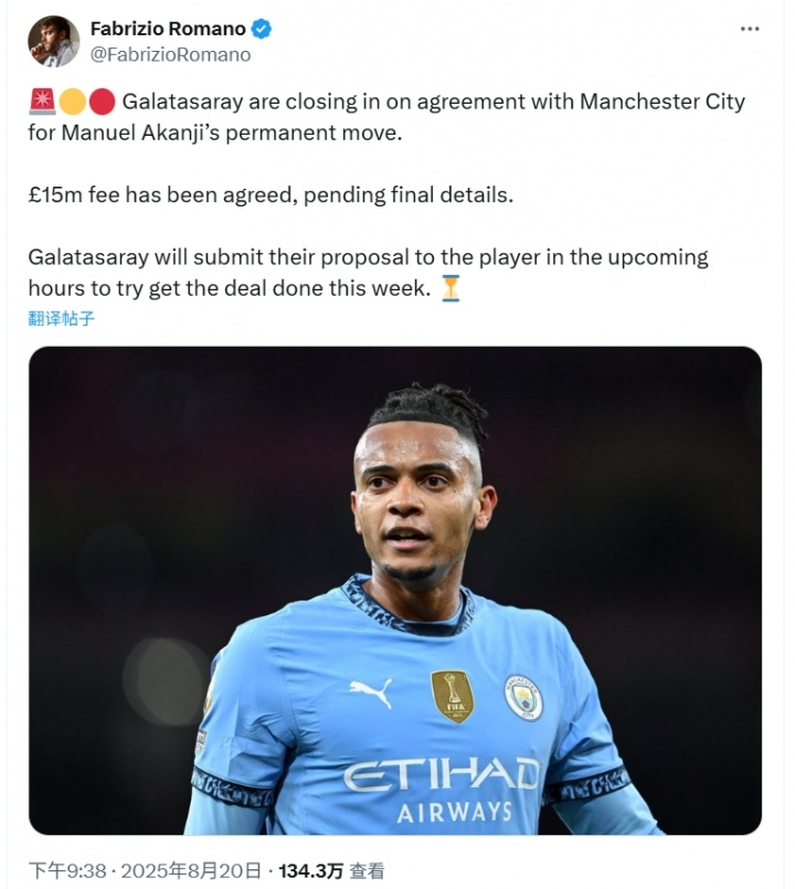 8月20日最新消息,据罗马诺早前披露,加拉塔萨雷正接近与曼城就阿坎吉的转会达成一致。